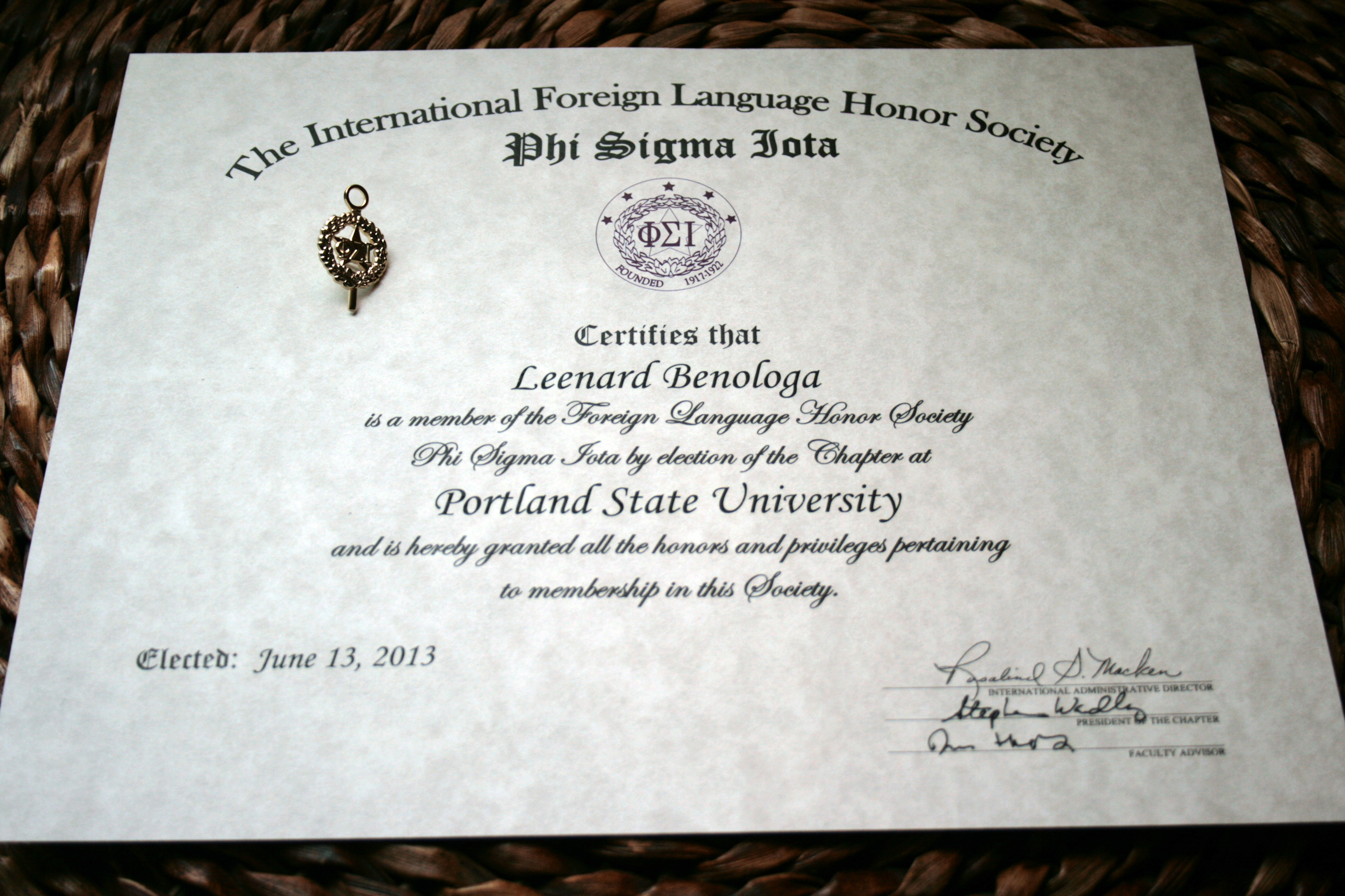 I just picked this up from PSU today, as I am now officially a member of the Phi Sigma Iota (Language) Honor Society. Of course, none of this would have been possible without my Mom and little brother, Juan, who have supported me in my strange desire to learn a language other than English and/or Tagalog. I also have so many Friends and family, (especially the Kagi family!) for all of the countless support throughout the years. Another big Thank You goes out to Junko (Mura-Sensei), who enticed me to continue learning the Japanese language when I was only a sophomore in high school. May you rest in peace.