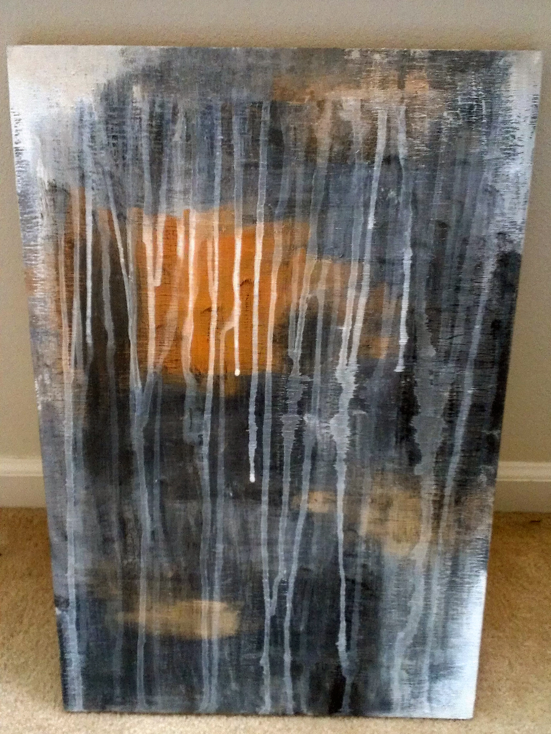 The canvas I’m using is a 24″x16″ hardwood from the Home Depot. I think I need a bigger brush in order to get the effects I desire, though. I think part of the problem is that I only really used one layer of acrylic paint. In order to really get that orange layer to “pop”, I think that in the future, I’m going to make sure that I paint an orange layer first, then quite possibly add another layer of the effect I want, and then (lastly) the final effect – if I were to use the “runny” looking paint “effect” again.