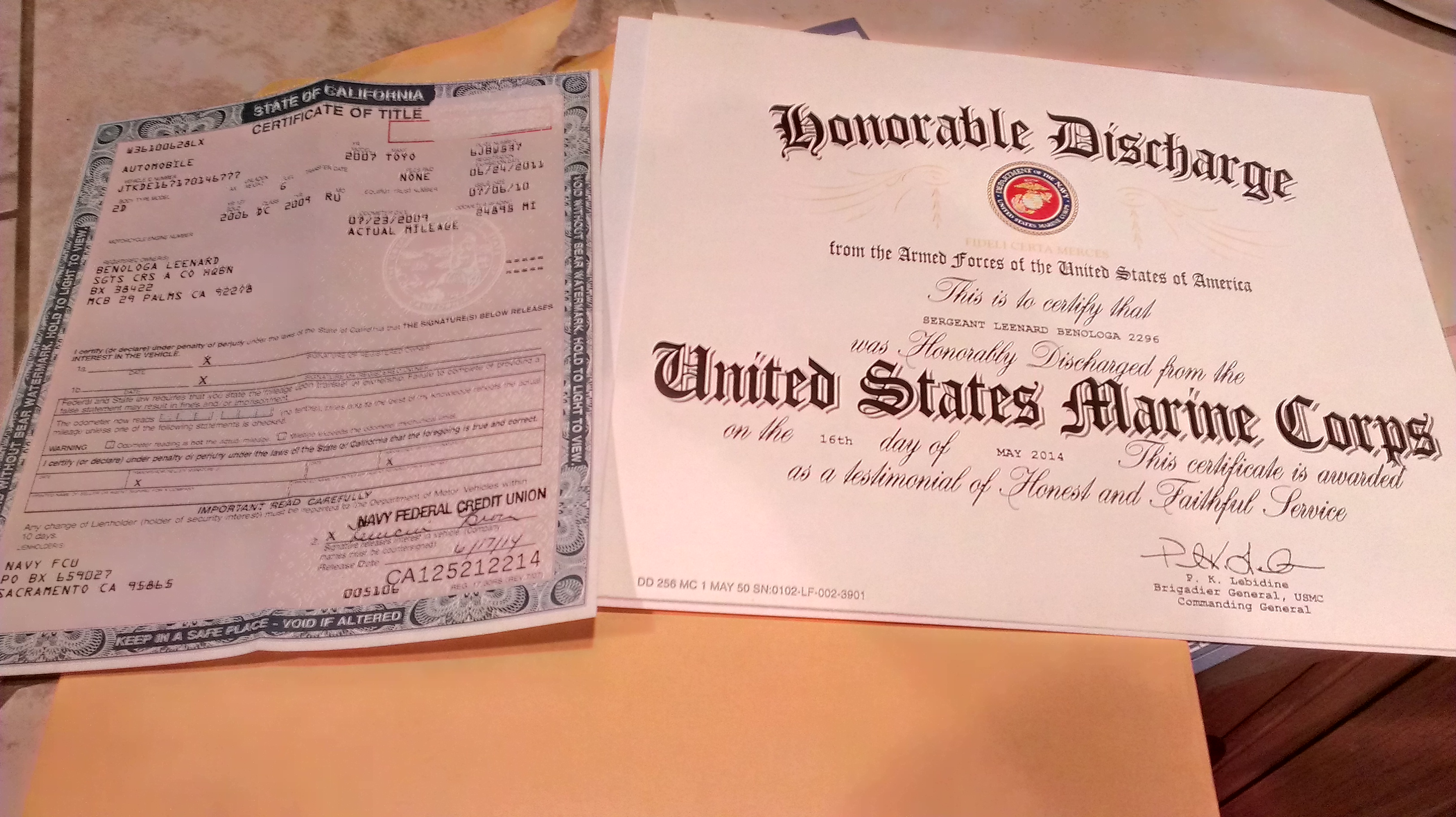 Wow. An entire week has flown by and only six short weeks remain before I leave for my new life in Japan. I have been feeling somewhat overwhelmed lately with all of the preparations I need to make in order to ensure a smooth transition before I leave, but one thing that brightened one of my days this week was receiving these two documents in the mail. The item on the left (in the picture above) is of the official title to my car (Cassandra – is what I named her). It still feels so surreal and (yet) so good to know that I managed to completely pay for my first car, my “dream car”, without any hitches or problems. I know it’s “only a car” but I think it’s more about the completion of my goal and the commitment I have to my goals that really makes me smile. The other document (on the right), is my official discharge from the United States Marine Corps after 8 years of active and inactive service. Has it really been that long already?